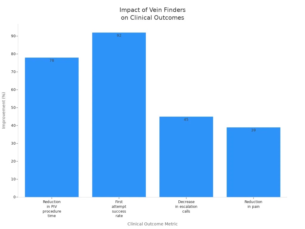 كما لاحظتَ أن الرضع والأطفال يستفيدون من انخفاض درجات الألم ومضاعفات أقل، مثل الارتشاح والتهاب الوريد. ينخفض متوسط وقت الإجراء من أكثر من ست دقائق إلى ما يزيد قليلاً عن ثلاث دقائق عند استخدام جهاز كشف الأوردة الاحترافي. تُبرز هذه التحسينات أهمية دمج هذه التقنية في ممارساتك اليومية. فأنت تقدم رعاية أفضل، وتحقق دقة سريرية أعلى، وتضمن راحة أكبر للمريض مع كل إجراء.