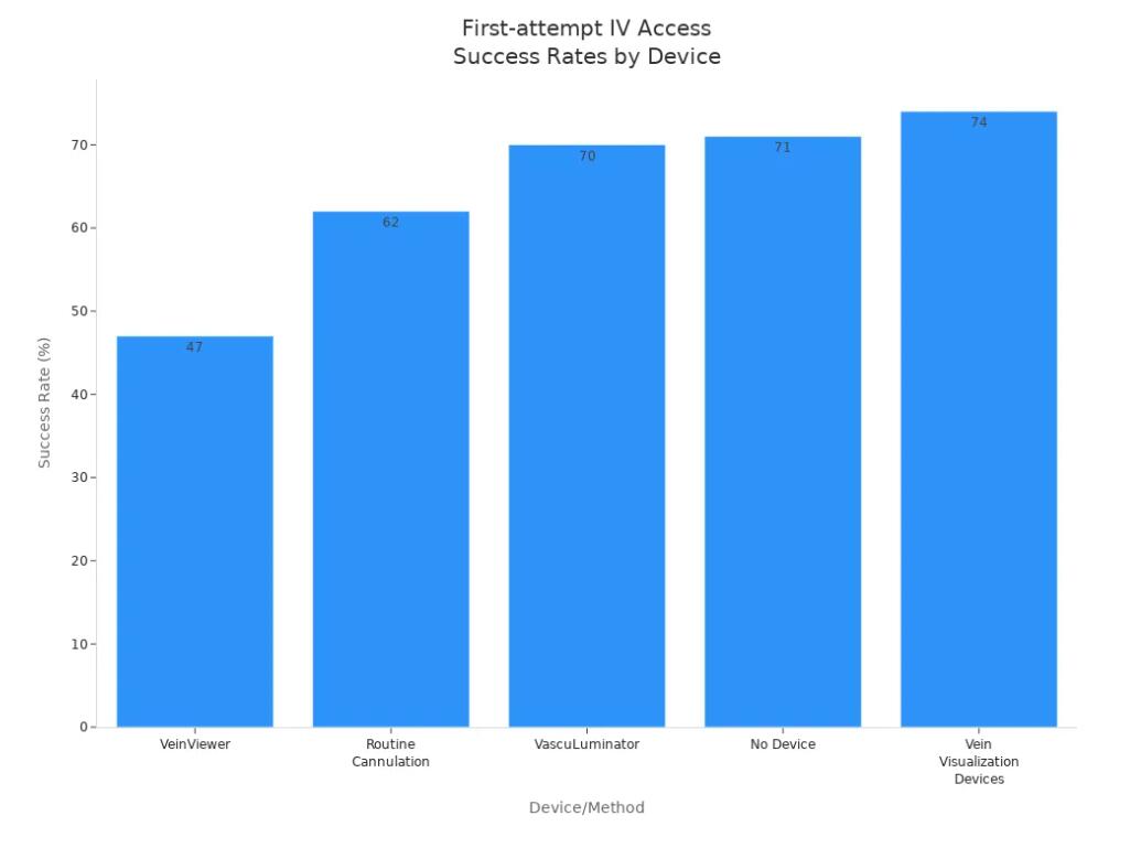 تريد أفضل أداة للوصول إلى الوريد. تُظهر الدراسات أجهزة الكشف عن الأوردة البارزة تساعدك أجهزة الإضاءة الخلفية على رؤية الأوردة بشكل أفضل، لكنها لا تزيد من نسبة نجاح الفحص من المحاولة الأولى بشكل ملحوظ مقارنةً بالطرق التقليدية. يوضح الرسم البياني أدناه أن نسب النجاح تبقى متقاربة، حتى مع استخدام جهاز كشف الأوردة أو جهاز الإضاءة الخلفية. يمكنك الاعتماد على كلا الجهازين لرؤية الأوردة، لكن لا يوجد جهاز أكثر فعالية أو موثوقية بشكل واضح لمعظم المرضى.
